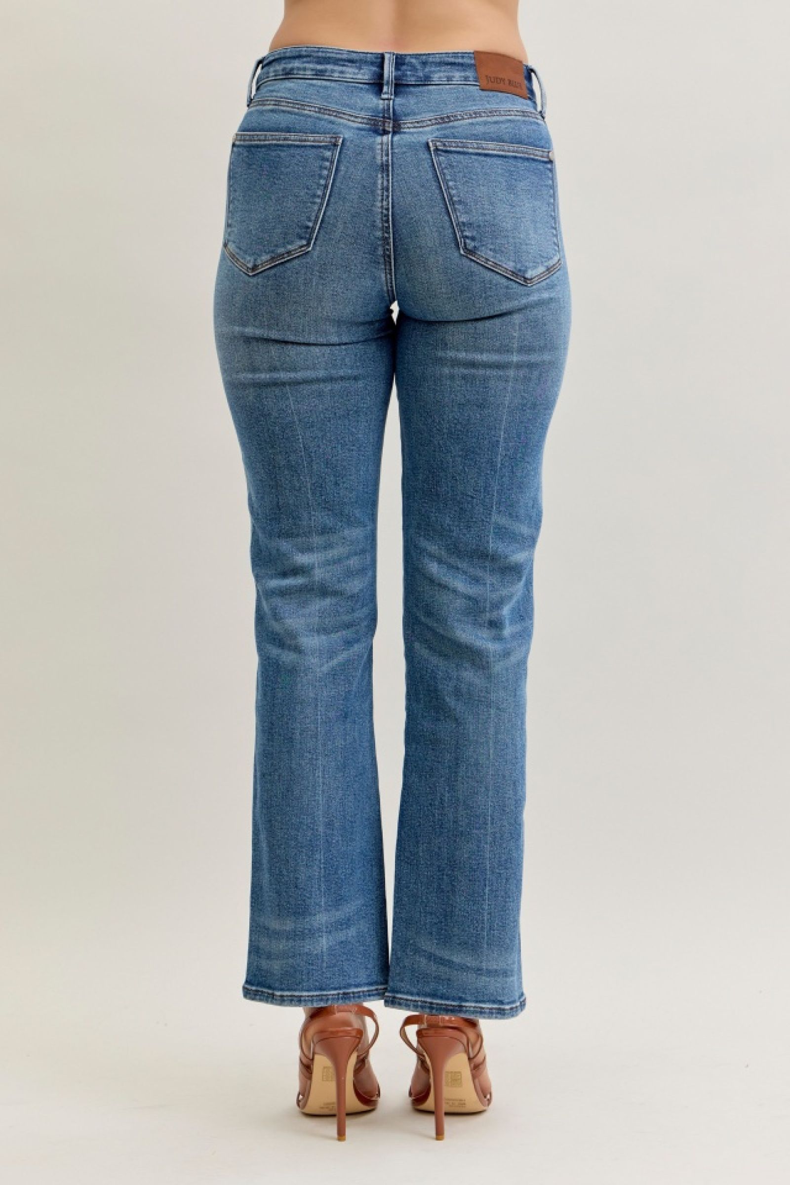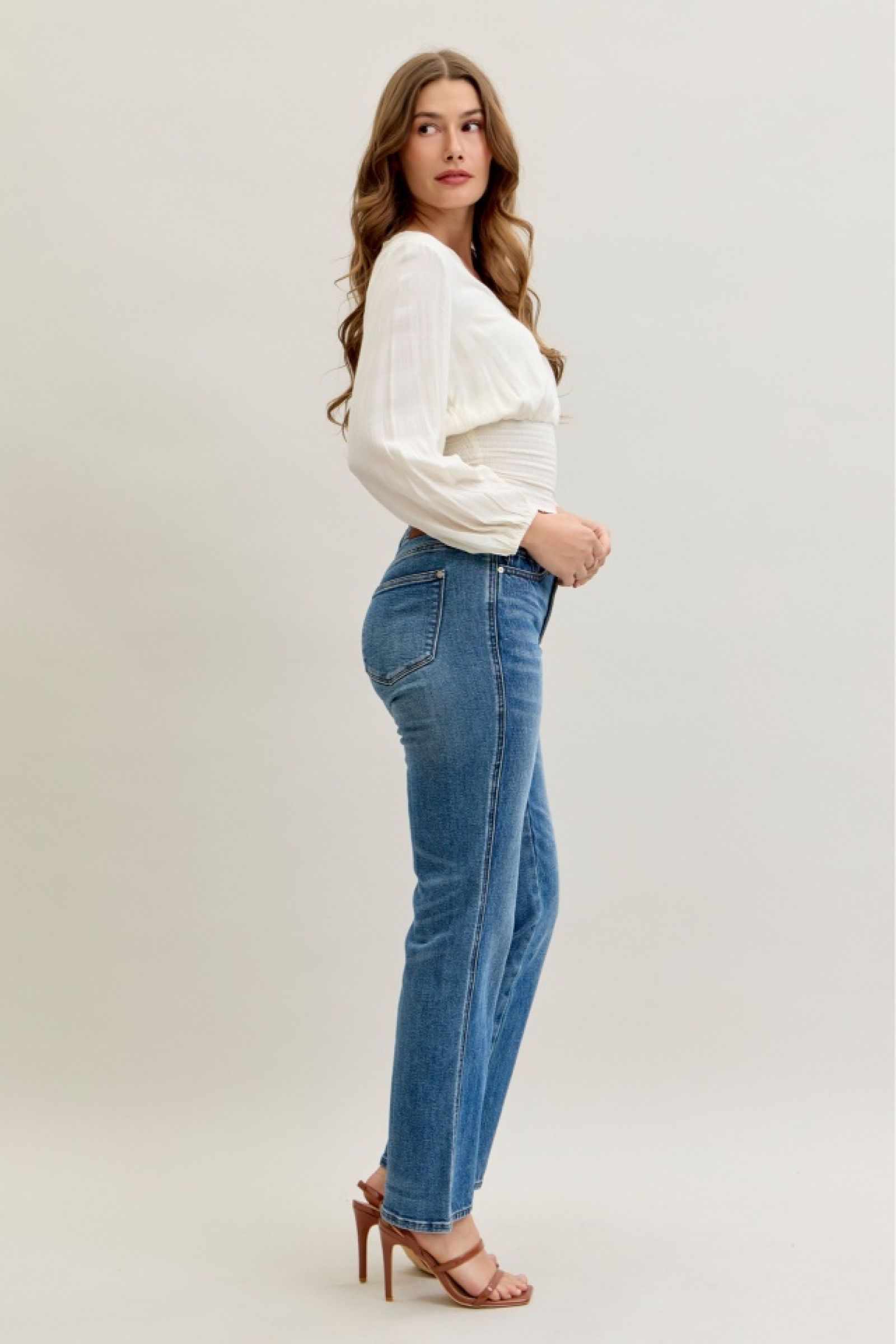 Judy Blue Mid Rise Slim Straight Jeans for Women – Rigid Magic Stretch Denim, Button Fly, Medium Wash, 30” Inseam